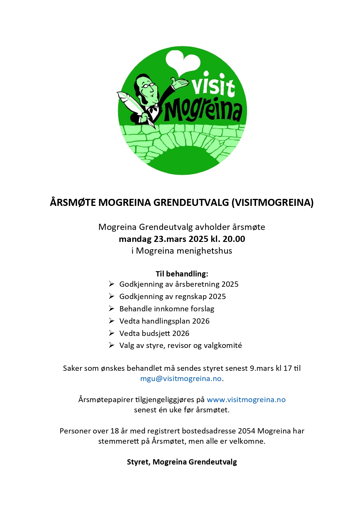 Årsmøtepapirene vil bli tilgjengeliggjort på www.visitmogreina.no